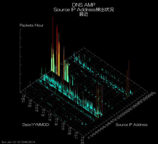 4時間継続したものは特定のソースアドレス。短期間のものは複数のアドレスをソースとするものなので、前者はDDoS、後者はリフレクション可能かのスキャン目的?