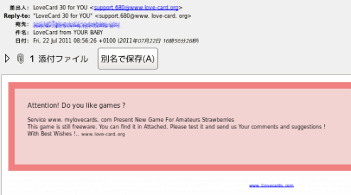 添付ファイルはこれ。http://www.virustotal.com/file-scan/report.html?id=717c042bbb783db4a31094058a36ee6fe34ba3fa1390b90df804cbb969b0ba6b-1311464808
