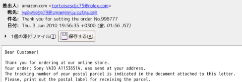 Outlook関連のものとAmazonからVAIO購入者にあてたような内容で内容的には過去に観測されていたもので、ファイル添付型です。