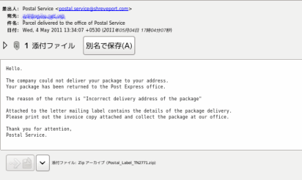 「お届け先アドレスが間違っていて、あなた宛のメール/ファイル/メッセージ/荷物を届けられませんでした。添付ファイルを確認してください」といういつものパターンの一つ。