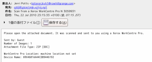 というか、スキャナーとかプリンターみたいな事務機器が送るスキャン結果、プリント結果のメールって、スパムネタ的には、いいターゲットなのかもしれませんね。何も考えず添付ファイルは必ず開かないといけないわけですから。