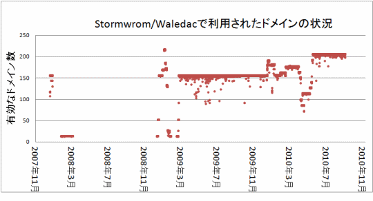 StormwormからIPアドレス的にはその後のWaledacやさらにその後のZeuSにも関連した220個のドメインの状況です。